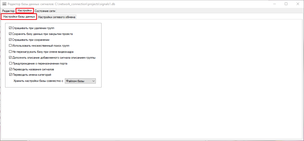 Рис. 24. Окно "Редактор базы данных сигналов" с выделенной кнопкой "Хранить настройки базы совместно с".