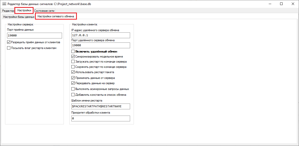 Рис. 25. Окно "Редактор базы данных сигналов" с выделенной вкладкой "Настройки" и подразделом "Настройки сетевого обмена".