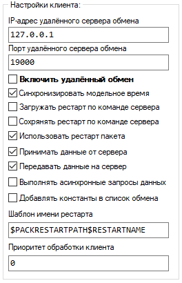 | Синхронизировать модельное время | Режим синхронизации модельного времени клиента с сервером. Активация данного пункта является необходимым условием для реализации сетевого обмена |