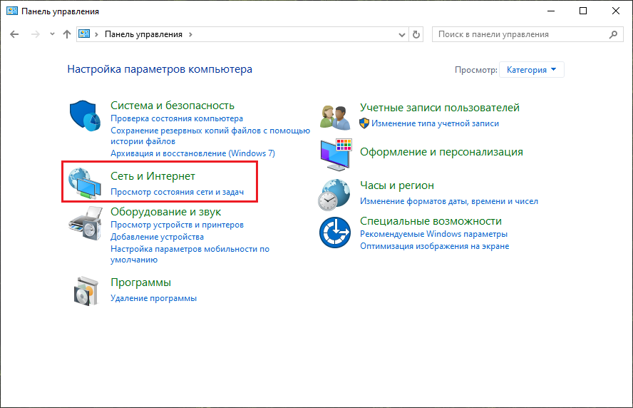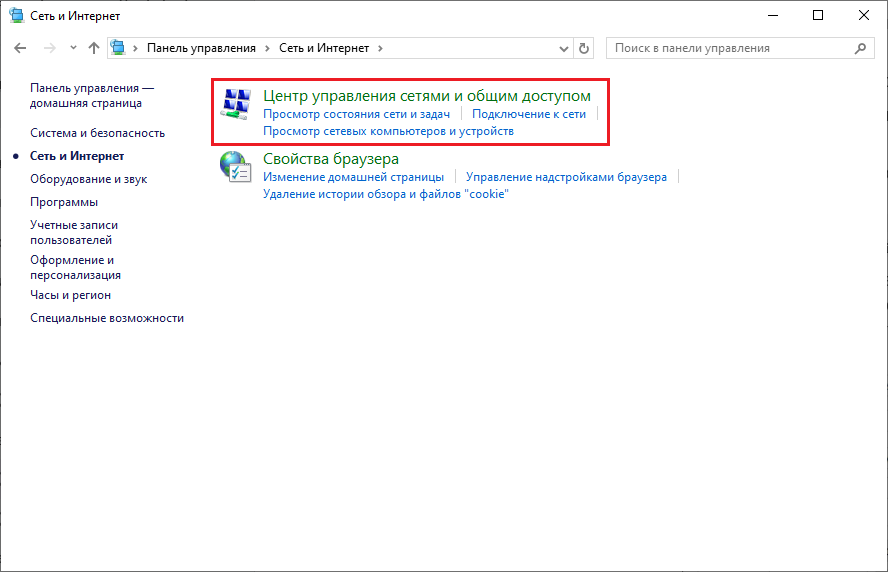 Рис. 3. Окно "Панель управления" с выделенным разделом "Сеть и Интернет". - В открывшемся окне выберите подраздел "Центр управления сетями и общим