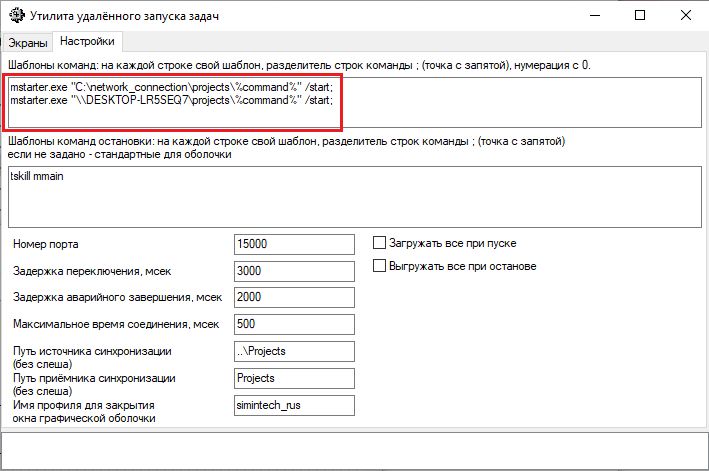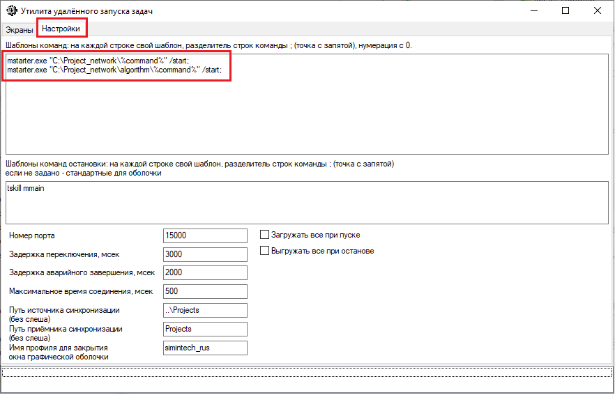 Рис. 31. Окно "Утилита удалённого запуска задач" с выделенной вкладкой "Настройки" и полем с заданными шаблонами команд. Пример задания шаблонов команд для расчета проектов, хранящихся в одной сетевой папке, представлен на рисунке (Рисунок 32).