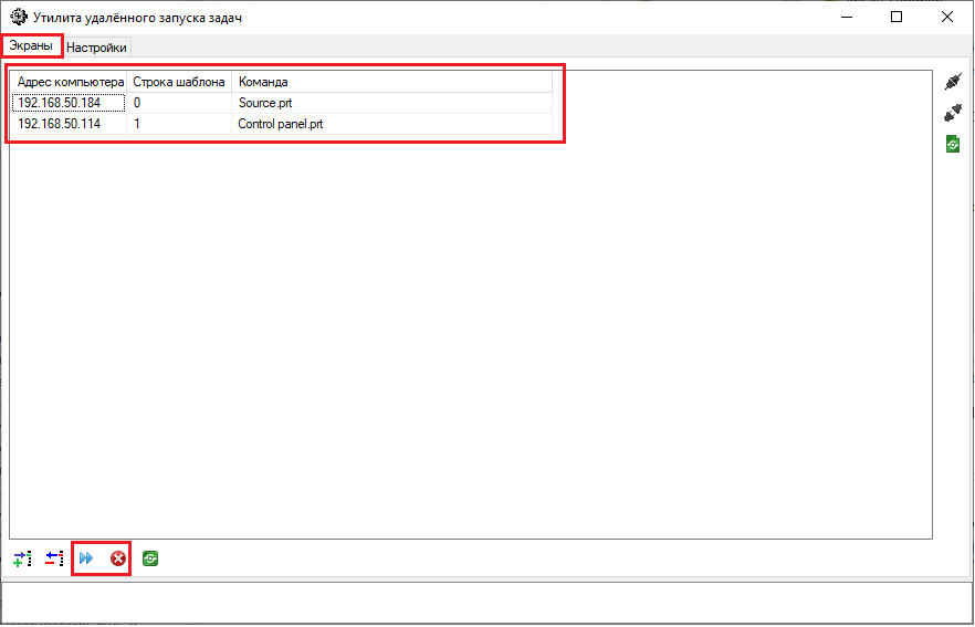 Рис. 32. Окно "Утилита удалённого запуска задач" с выделенным полем, содержащим заданные шаблоны команд с доступом к общей сетевой папке. - Установить свойство "Задержка переключения, мс" равным от 2000 до 3000. Данное свойство предназначено для обеспечения паузы между отправкой команд на разные компьютеры. Значение задержки подбирается экспериментально в зависимости от сложности проектов и скорости работы компьютеров.