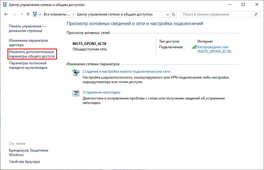 Рис. 5. Окно "Центр управления сетями и общим доступом" с выделенным пунктом "Изменить дополнительные параметры общего доступа". - В меню "Изменение параметров общего доступа для различных сетевых профилей"