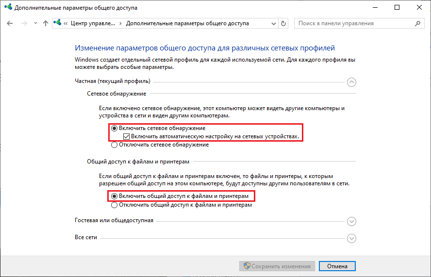 - "Включить сетевое обнаружение"