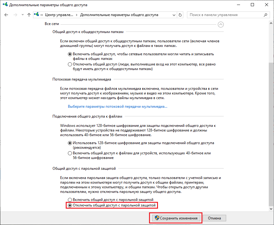 - В строке "Общий доступ с парольной защитой" выберите пункт "Отключить общий