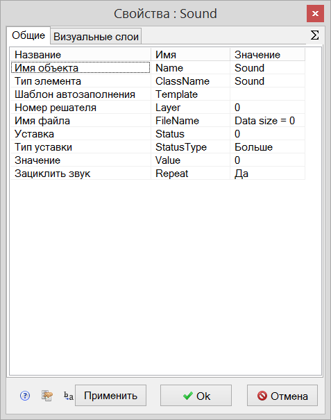 | Тип элемента | ClassName | Sound | Значение предопределено | Тип объекта, определяющий его внешний вид объекта и набор свойств. |